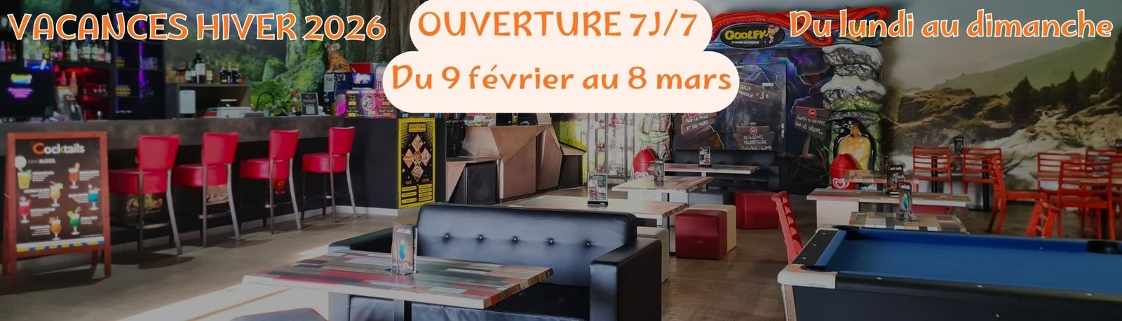 Une salle de 200 m² (billards, babyfoot, jeux enfants) et une terrasse ombragée de 90 m² pour un moment de détente devant un verre ou un petit en-cas, à tout moment de la journée.