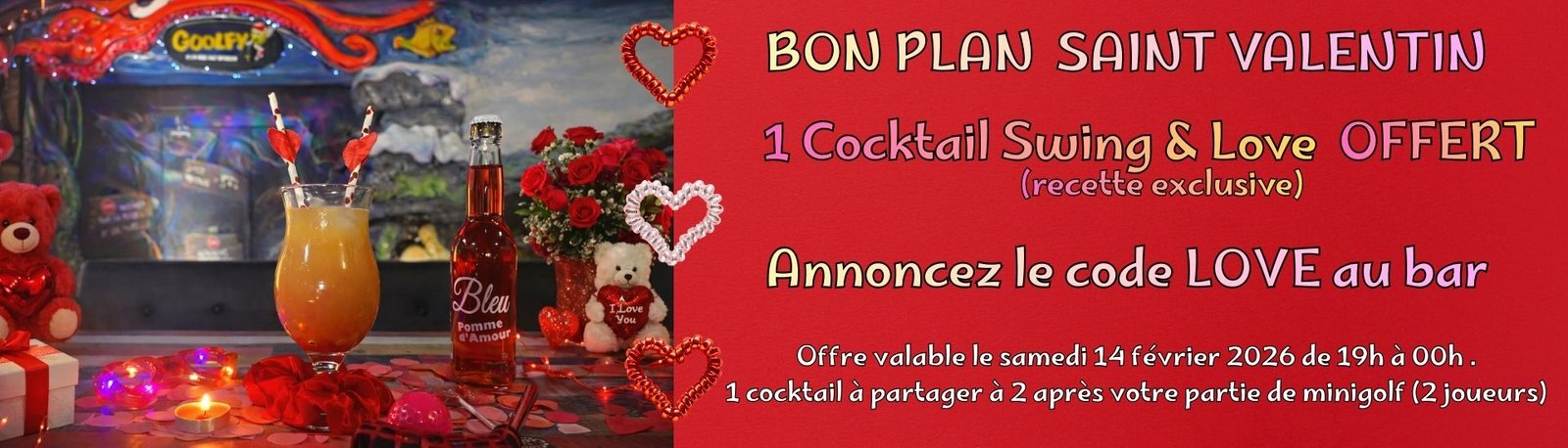 A partir de 18h, Goolfy se transforme en pub où vous pourrez déguster une planche de tapas (sur réservation) accompagnée d’un bon verre de vin. Profitez de l’écran géant, faite une partie de billard, de babyfoot, participez à une soirée à thème ou à une soirée karaoké. Le Minigolf reste bien sûr ouvert pour encore plus de fun !!!